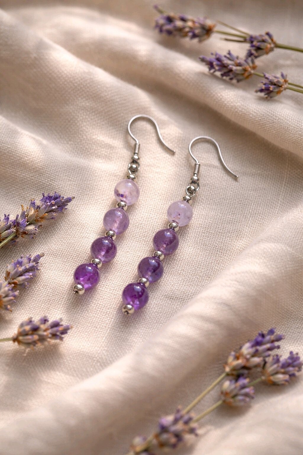 Sublimes boucles d'oreilles en améthyste naturelle, dévoilant de délicates nuances violettes. 4,5 cm L'élégant montage en acier inoxydable assure un confort optimal et une légèreté incomparable. Fabrication artisanale soignée.
