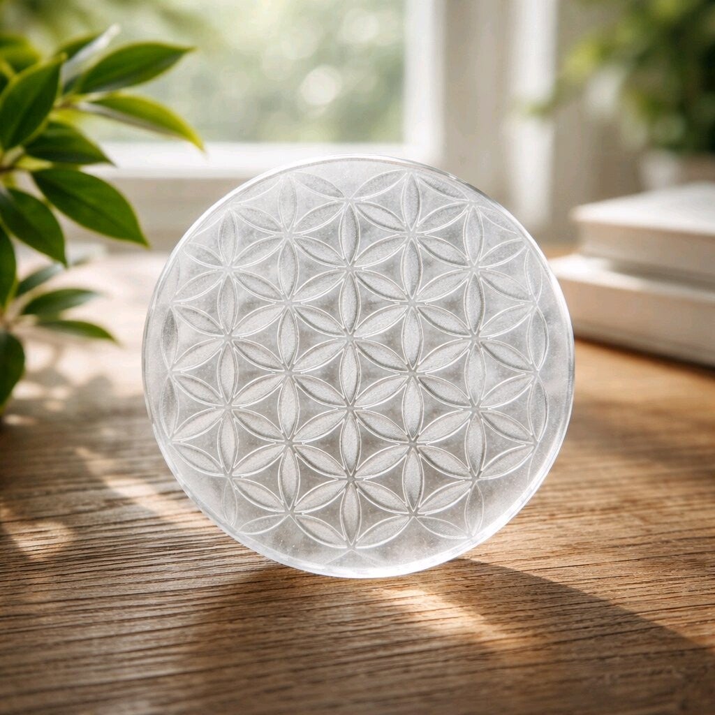 Plaque ronde en sélénite naturelle, finement gravée du symbole Fleur de Vie.