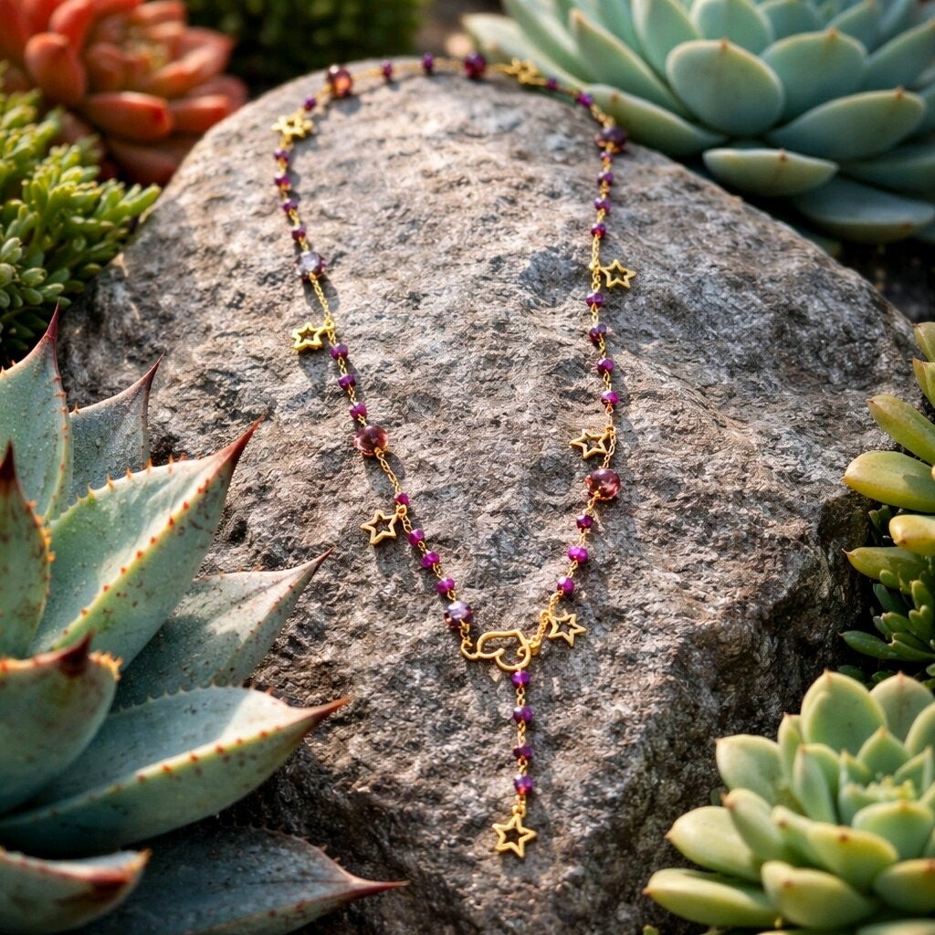 Ce collier fantaisie raffiné est composé de perles violettes aux reflets lumineux, mêlées à de petites étoiles dorées qui apportent une touche de poésie et de magie.