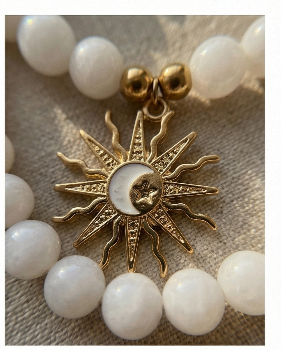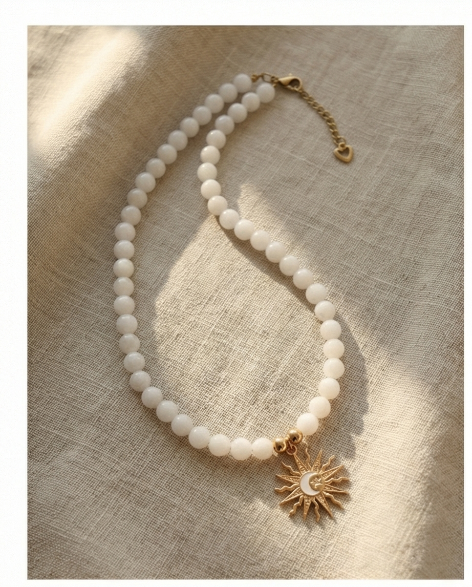 Craquez pour ce collier en perles de lune 8 mm, sublimé par son soleil doré ☀️