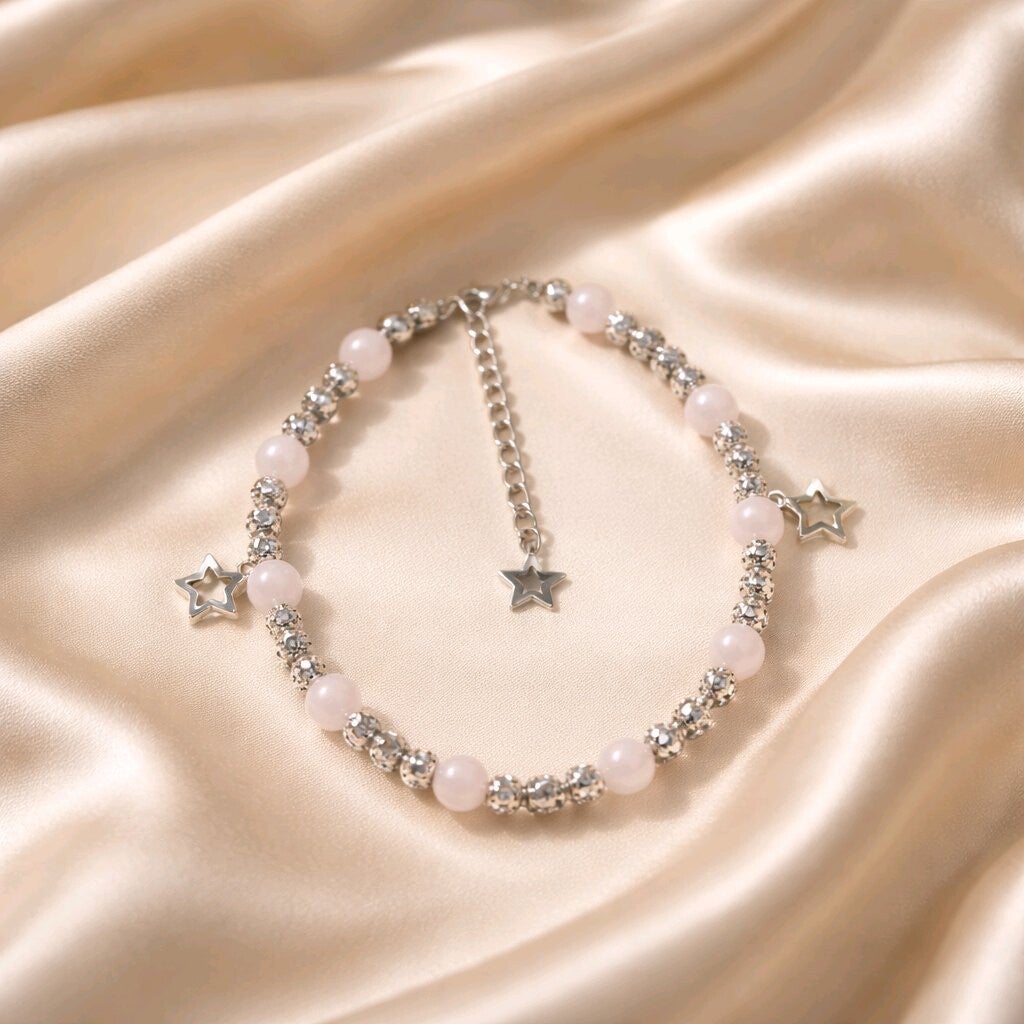 Craque pour la douceur de ce bracelet de cheville en quartz rose, accompagné de perles en acier argenté